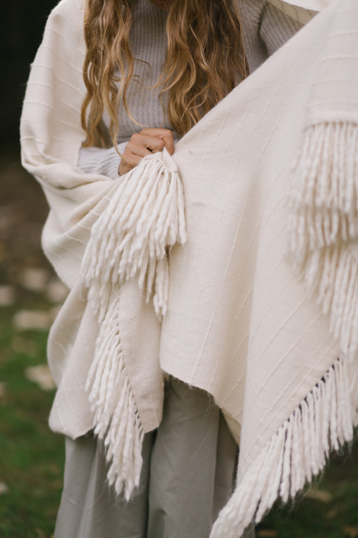 Esta pieza contiene detalles en pushka, una técnica artesanal muy especial para hilar la fibra de alpaca, tanto en el cuerpo como en los flecos.