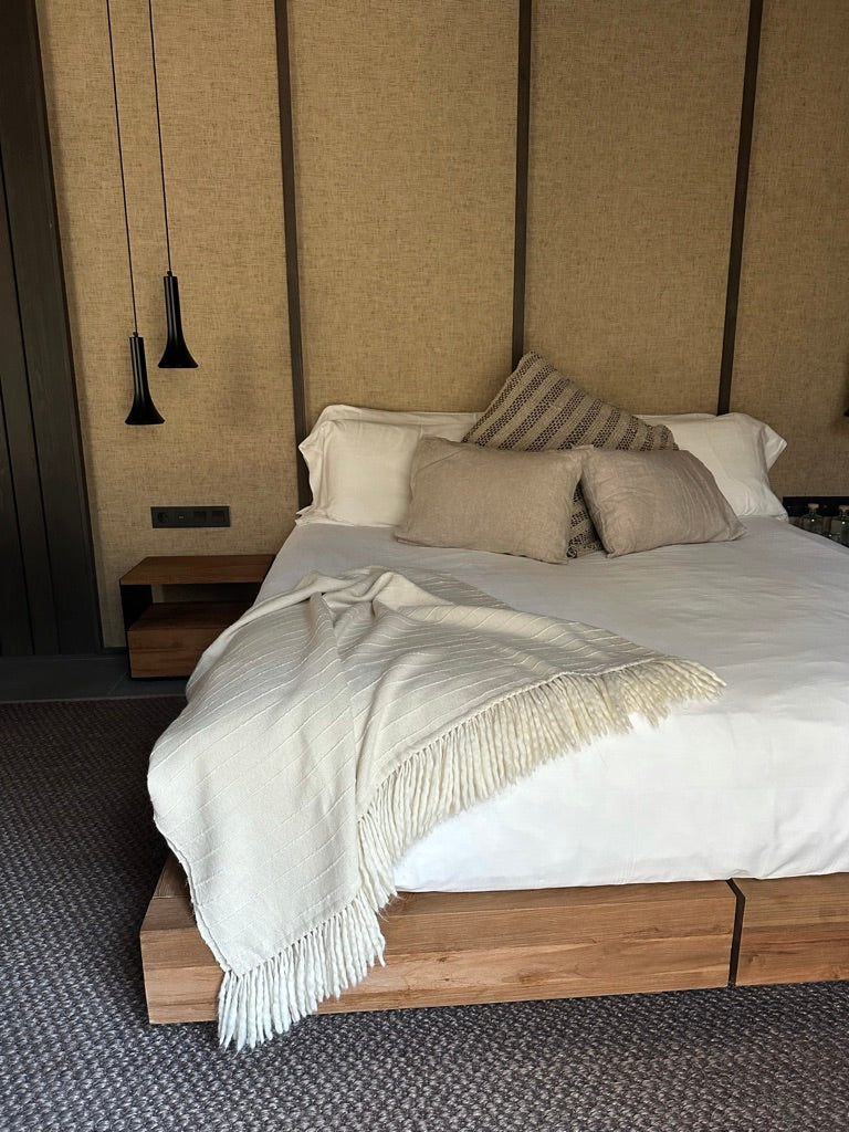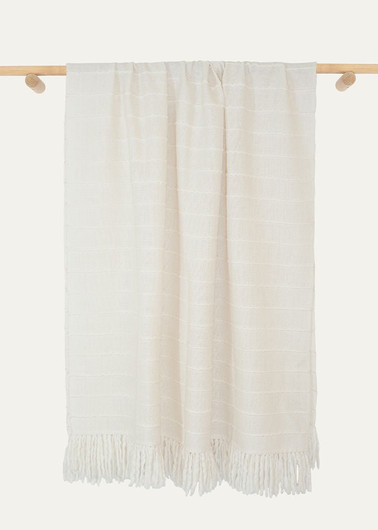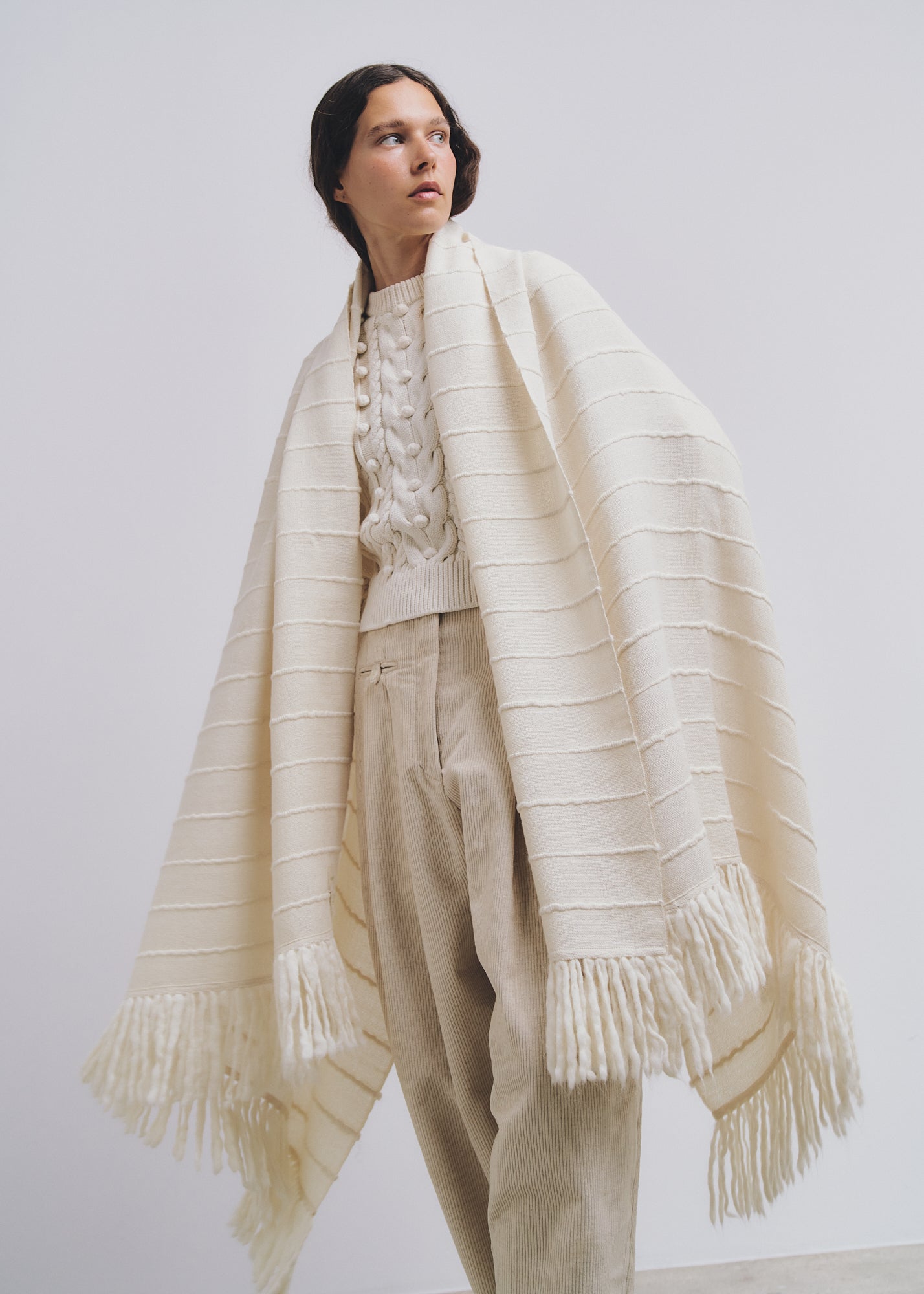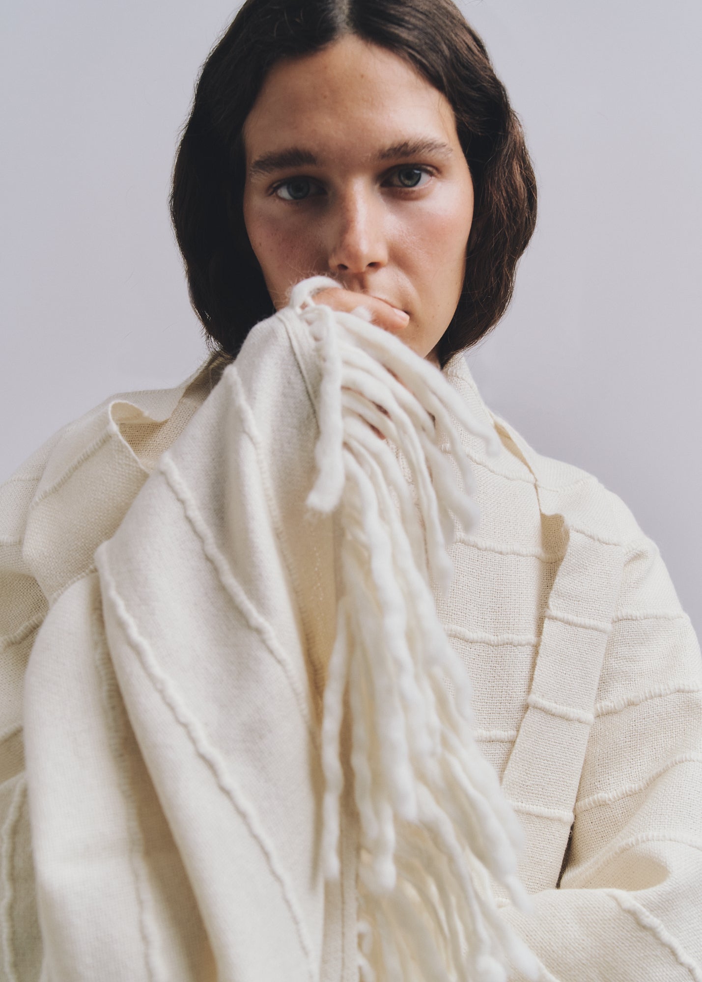 Increíblemente suave y cálida, esta manta está tejida manualmente en los Andes a partir de fibra 100% baby alpaca, una de las fibras naturales más exquisitas que existen. Combinando diseño moderno y tradición artesanal, es una pieza muy versátil que puede utilizarse tanto como manta o como chal XL, aportando textura a los espacios o looks más minimalistas y elegantes.