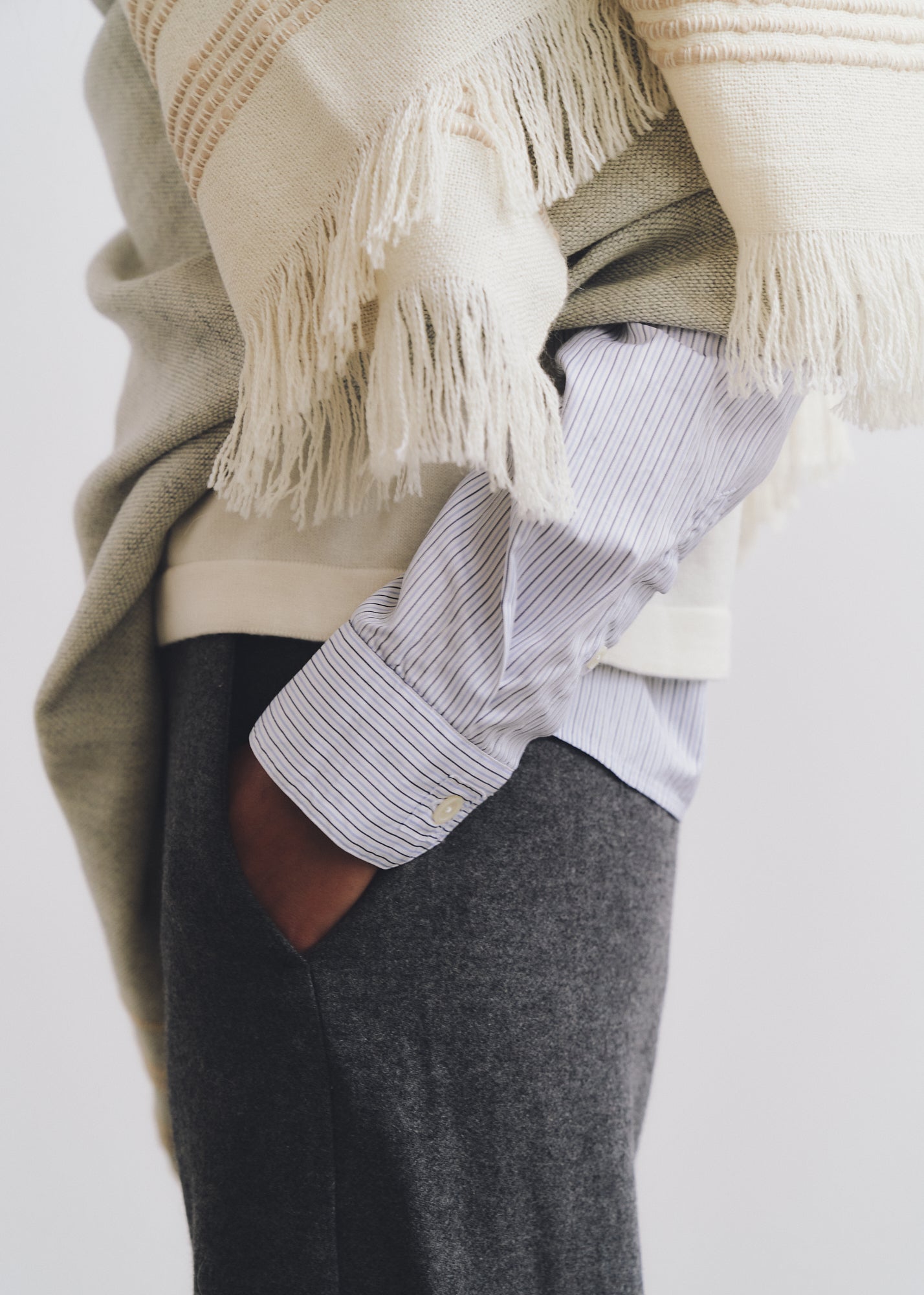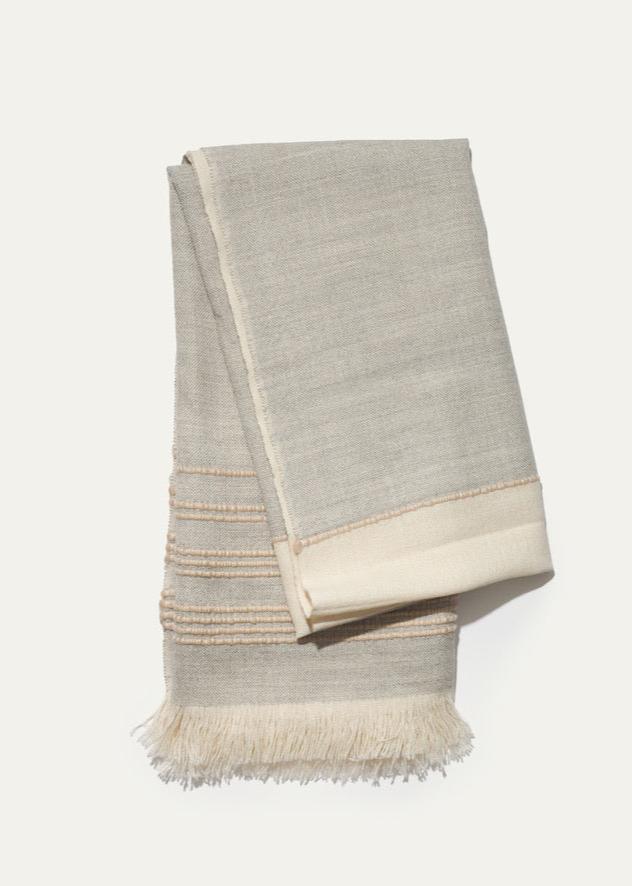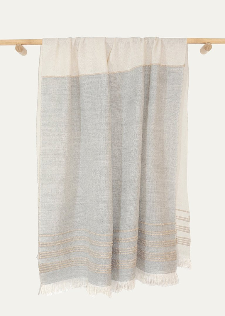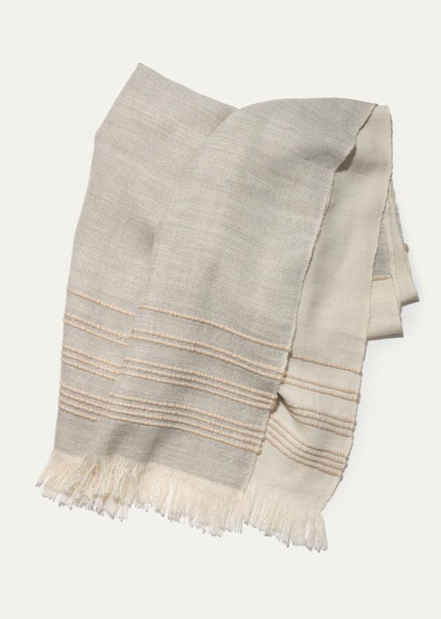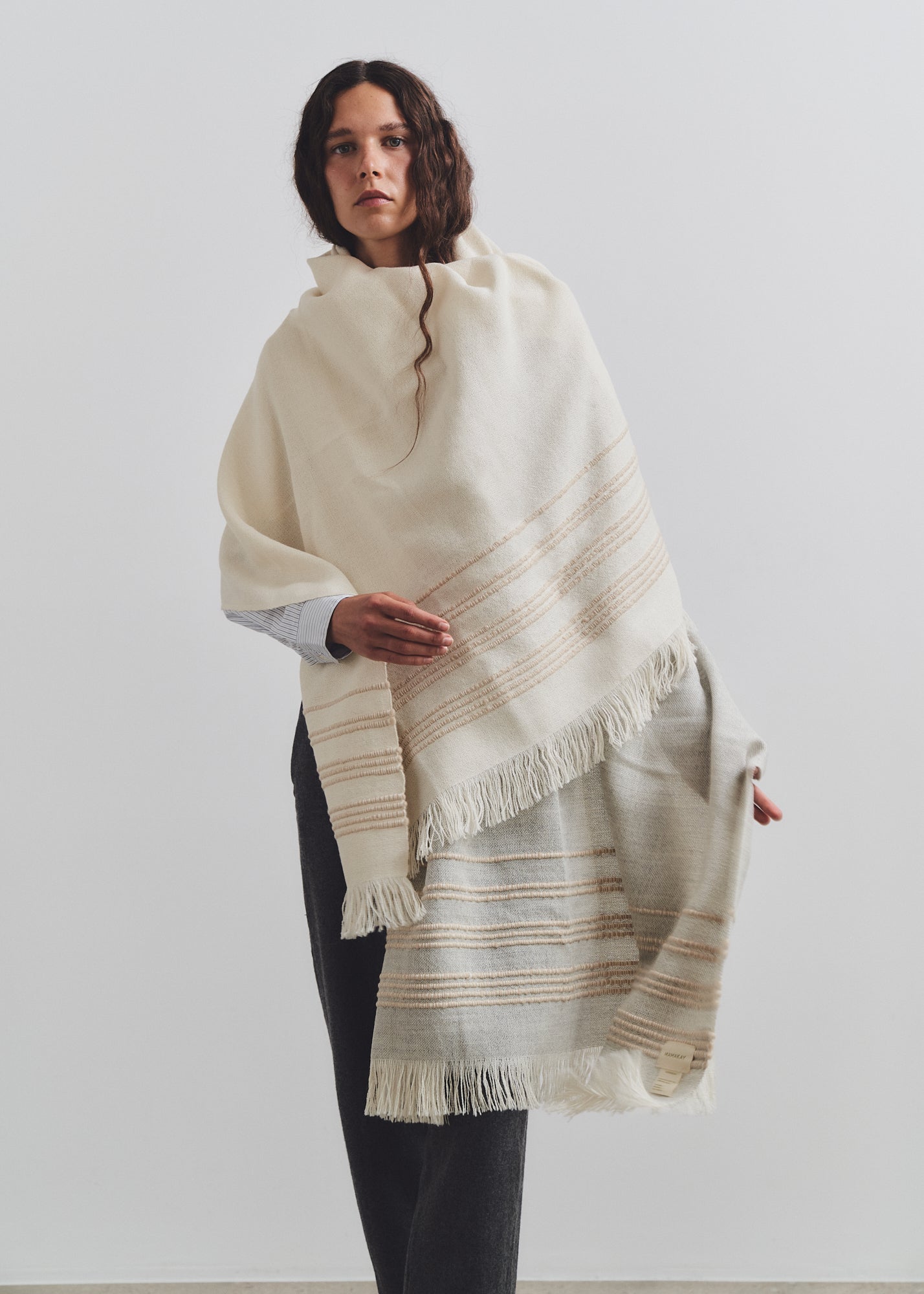 Increíblemente suave y cálida, esta manta está tejida manualmente en los Andes a partir de fibra 100% baby alpaca, una de las fibras naturales más exquisitas que existen. Combinando diseño moderno y tradición artesanal, es una pieza muy versátil que puede utilizarse tanto como manta o como chal XL en los días más fríos, aportando textura a los espacios o looks más minimalistas y elegantes.