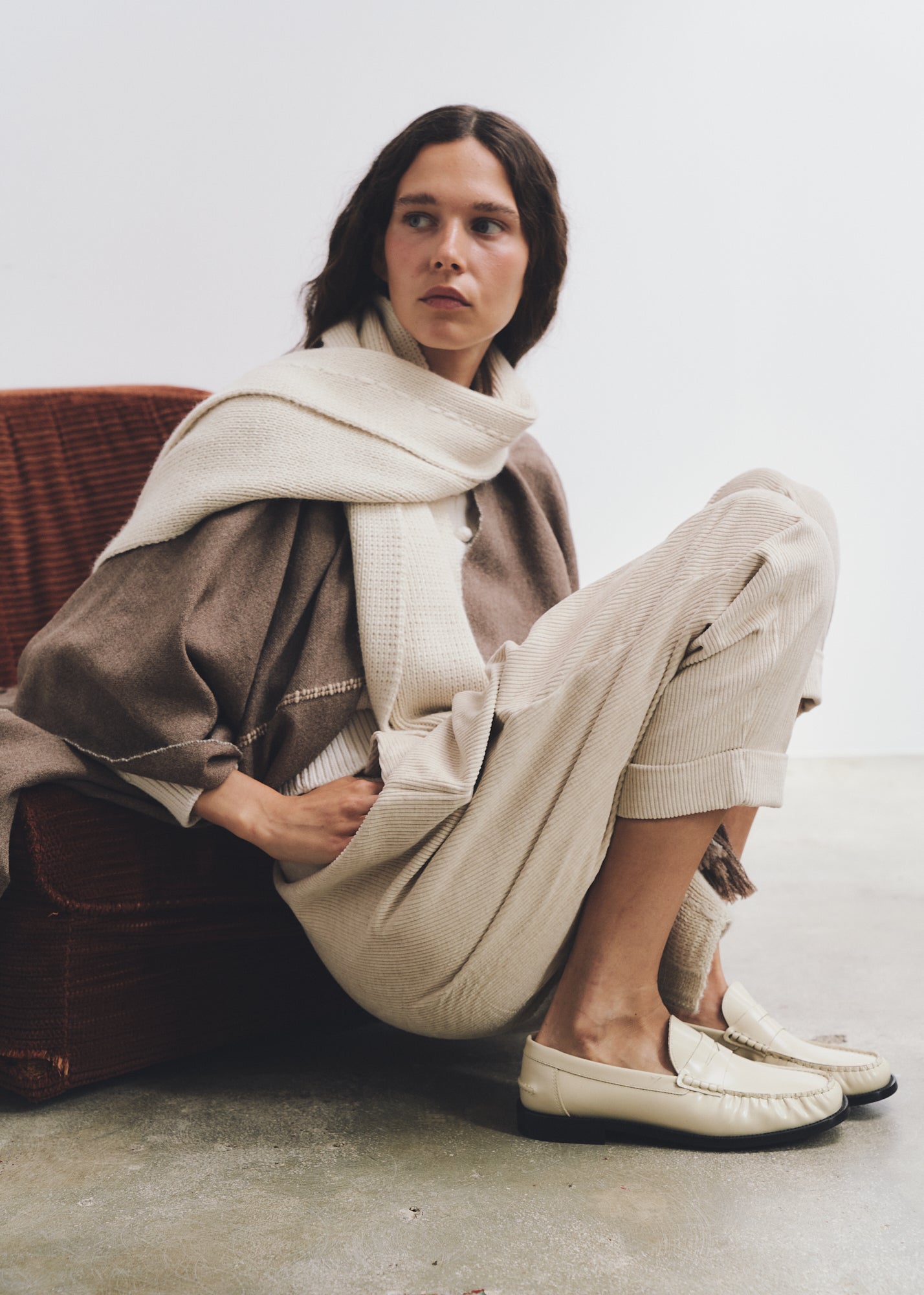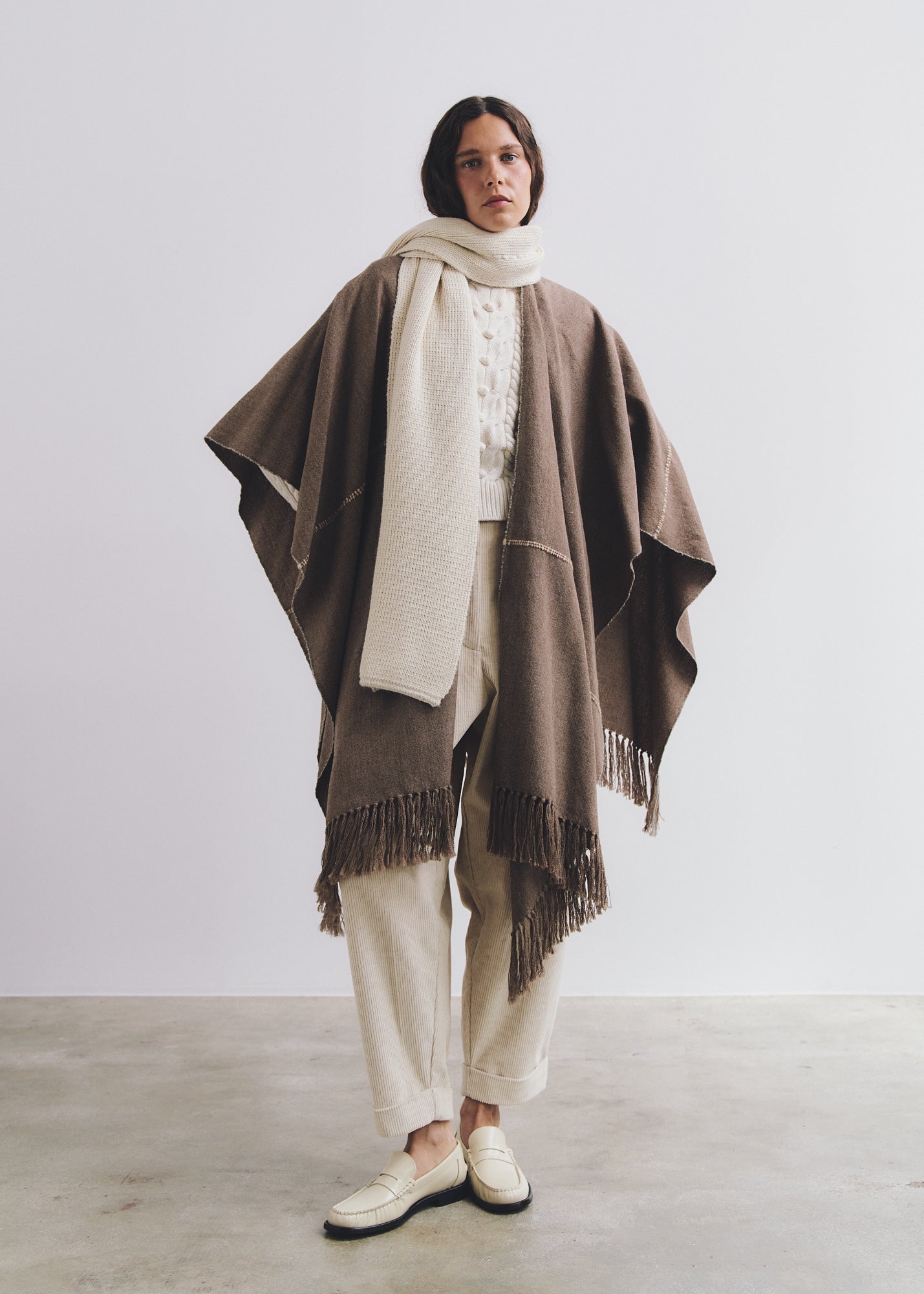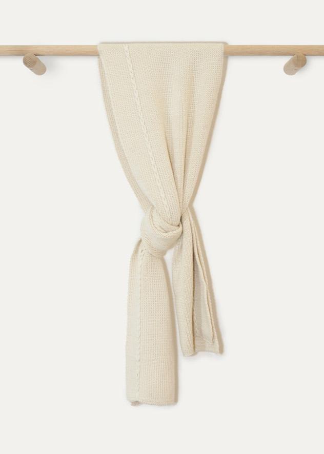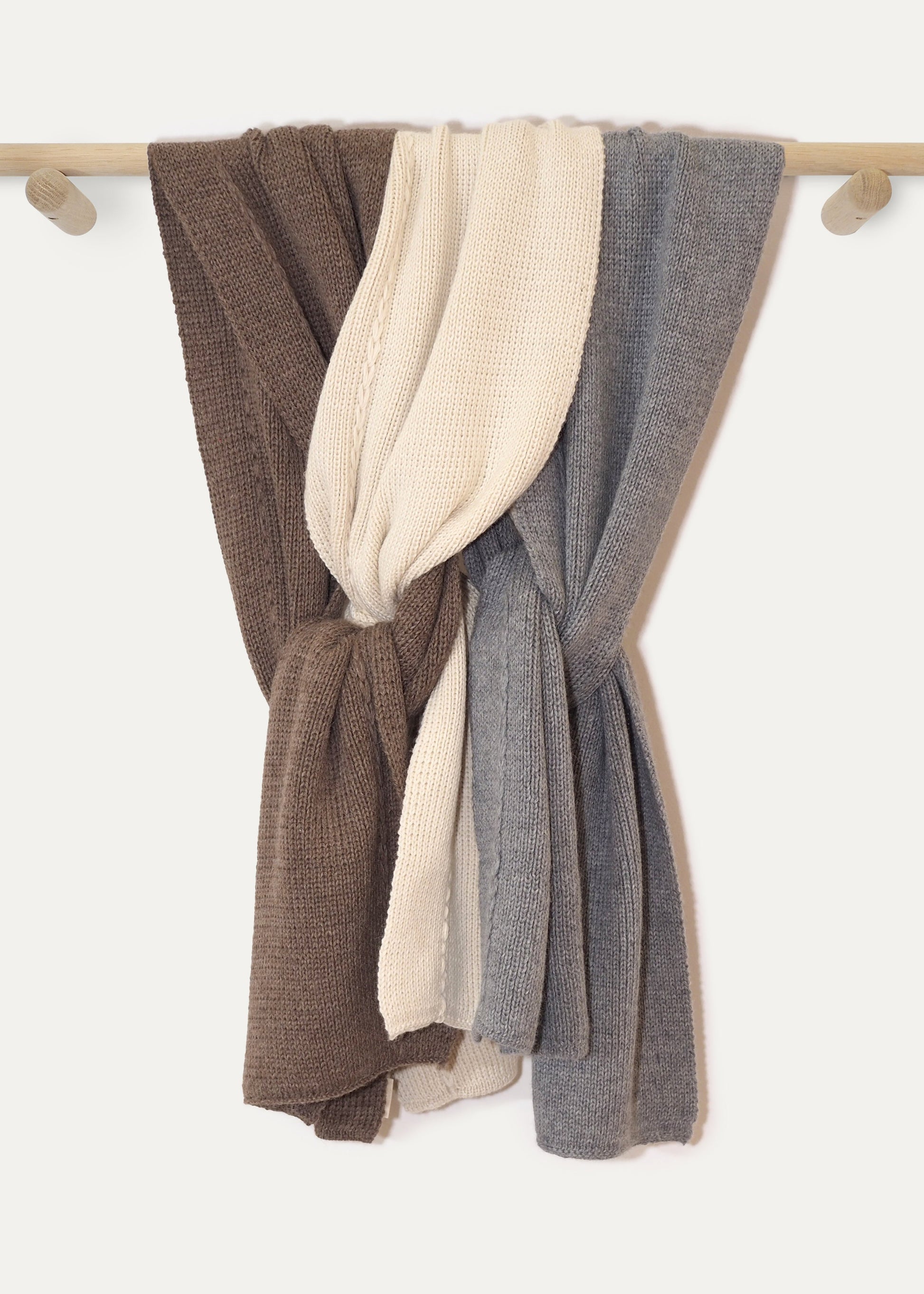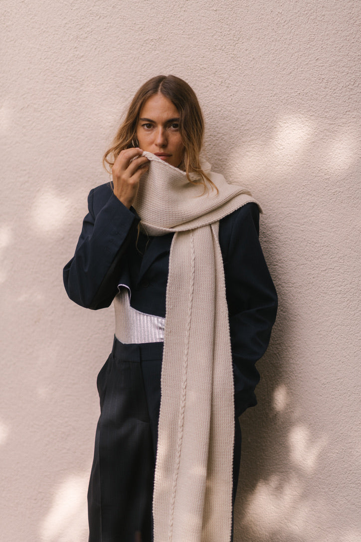 Tejida artesanalmente con fibra 100% baby alpaca, la bufanda destaca por su textura increíblemente suave y esponjosa, que envuelve la piel en un perfecto equilibrio de confort y ligereza.