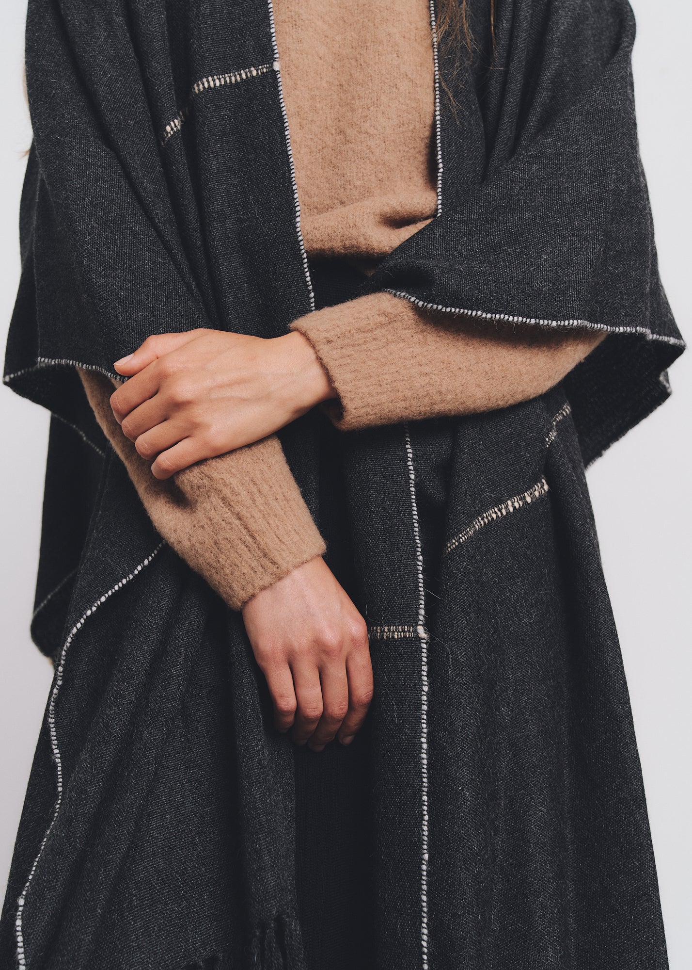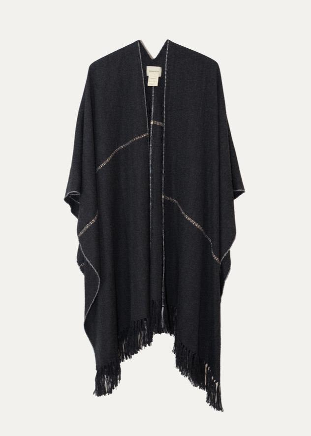 Estilo y exquisitez definen el poncho Guillermina, que combina diseño moderno y tradición artesanal. Una pieza elaborada en telar manual con fibra 100% baby alpaca por familias de artesanos de los Andes Peruanos.